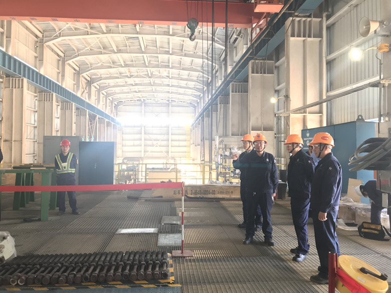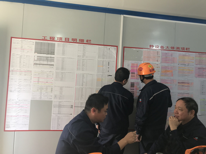 在巡查检修现场后,刘董事长来到连续重整装置,重点查看K201/K202机组检修现场,与机组汽轮机检修负责人李忠文仔细交谈,并询问该关键机组的受损情况,包括其解体拆卸、转子吊装、机组零部件的清洗、损害、修复、更换情况和是否存在技术难题等。面对眼前一张张年轻的面孔,他们熟练的使用各类工具,为压缩机进行体检修复,规范的作业流程、细致的标准化管理,刘董事长露出了会心的微笑。随后,刘董事长来到静设备检修指挥部,参观他们的库房物资,并与静设备经理舒思军探讨检修现状,仔细查看他们的销项明细,了解检修整体进度和员工的工作情况,并提出对与重点甩头类的技改项目和时间紧、任务重、工期短的相关装置,要合理配置人员,在确保安全、质量的前提下,优质、绿色、正点的完成检修任务,实现互利共赢。